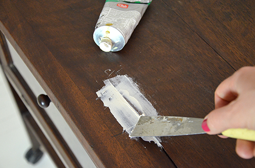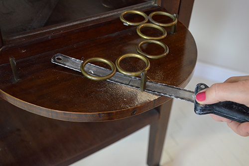 A törött kupicatartót (amibe egyébként semmilyen kupicaforma nem fért bele, pedig végigpróbáltam több fajtát is) lefűrészeltem, a repedéseket, lyukakat fatapasszal tömítettem, majd a javított részeket lecsiszoltam.