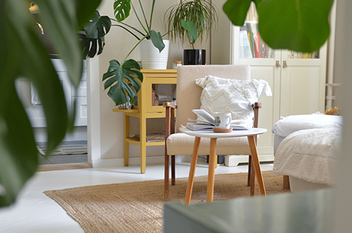A tv helyén pedig egy hangulatos olvasósarok lett az ablakon beáramló fényekkel, zöld növényekkel, és az okkersárga színnel megbolondított zsúrkocsival.