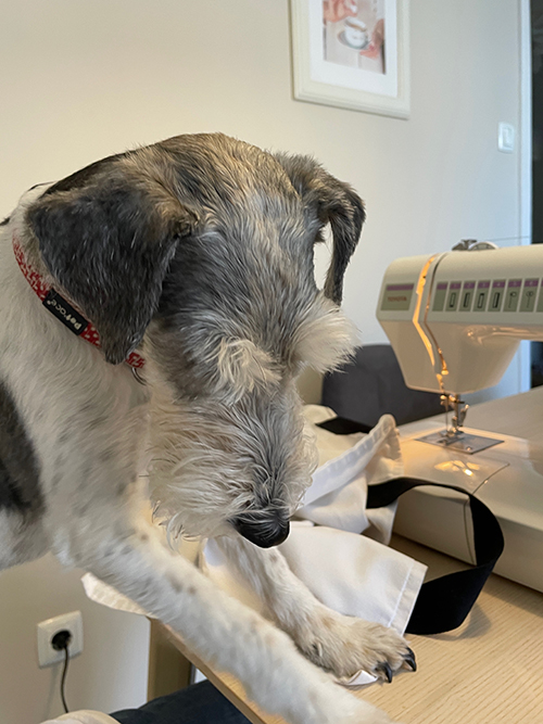 Először a füleket varrtam fel úgy, hogy a cipzár megmaradjon és használható is legyen. Franci amúgy konkrétan kitúrt a varrógép elől, ahogy öregszik, egyre több ilyen akciója van.