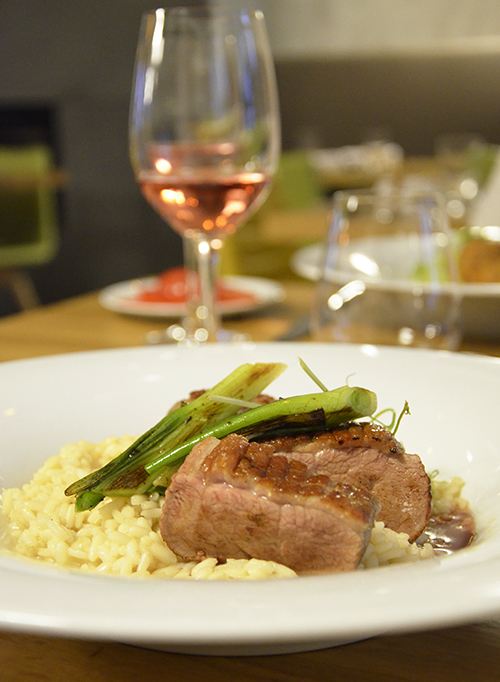Rosé kacsamell, risottó, újhagymával tálalva: