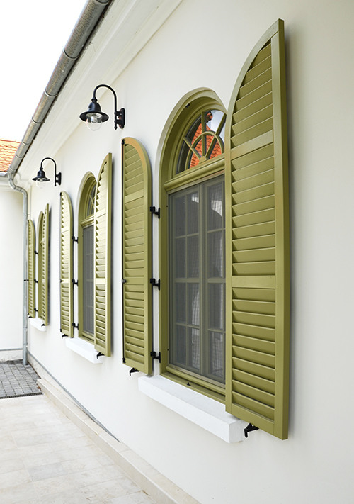 Az első, amitől rögtön elolvadtam, azok az olíva színű, kazettás fa ablakok és zsalugáterek. Tudjátok, hogy a fa nyílászárók szerelmese vagyok, pontosan azért, amit képvisel: benne van a régmúlt, és az a fajta otthonos és természetes elegancia, amit egy műanyag nyílászáró – számomra – nem tud nyújtani. Ezt a fajta „rajongást” biztosan a régi családi házunkból hozom (ITT), hisz a mai napig bennem van az ablakok csukódó hangja…