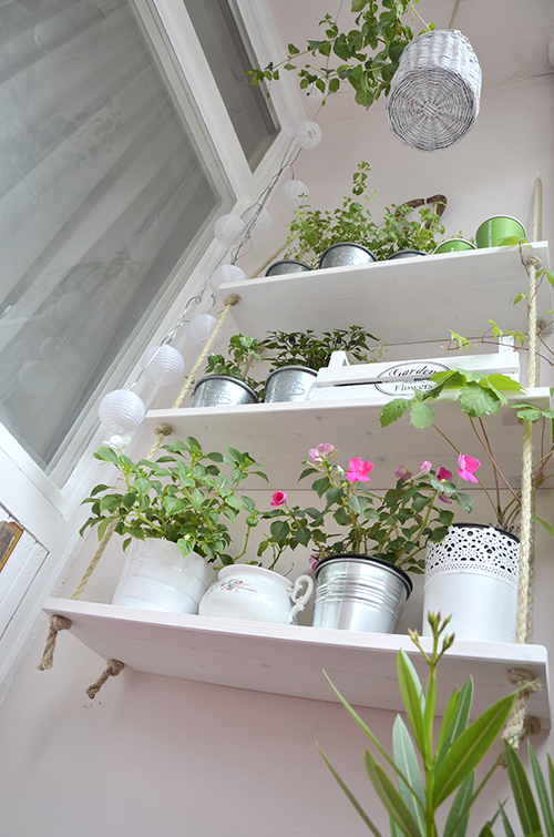 Eddig már mutattam részleteket, mint pl. a kötelekből készült polcot és a deszkakorlátot, de többen is írtatok, hogy jó lenne az egészet egyben látni! Ezt befotózni amúgy nem könnyű feladat, hisz kell egy nagylátószögű objektív, ami az egészet átfogja, de még azzal is nehéz, mert az erkélyen összesen lehet 3-at lépni, azt is lóugrásban: egyet előre, kettőt balra… Szóval Borostás és én is csimpaszkodtunk a korláton, álltunk a székeken, feltapadtunk a falra, hogy a lehető legjobb szögekből tudjuk megmutatni az erkély összképét. Nos, az erkélyre kilépve ez látható: