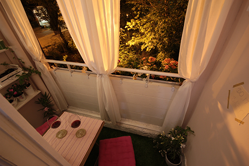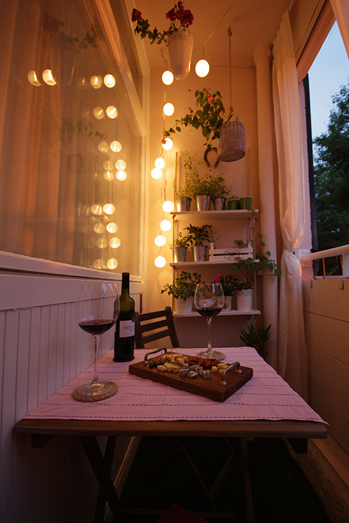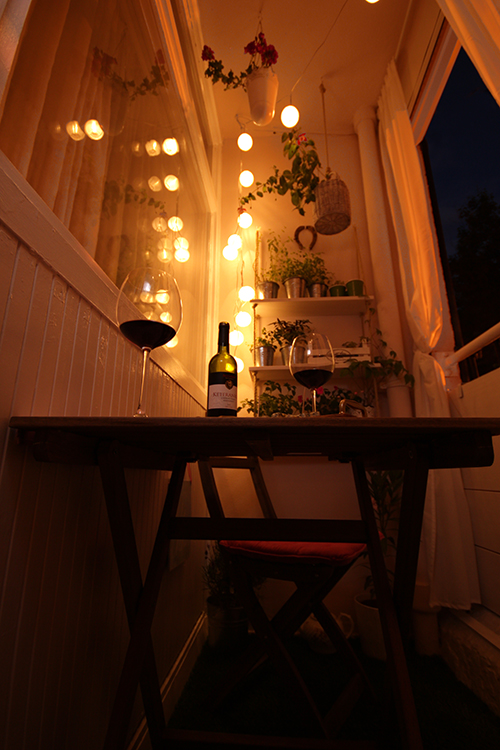 Az erkélynek van egy másik arca is, amikor kint elkezd besötétedni és a napelemmel működő gömblámpák felkapcsolódnak:
