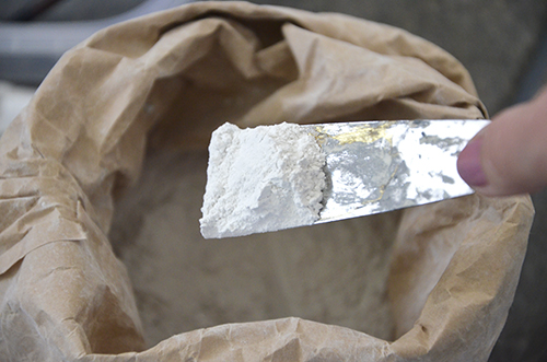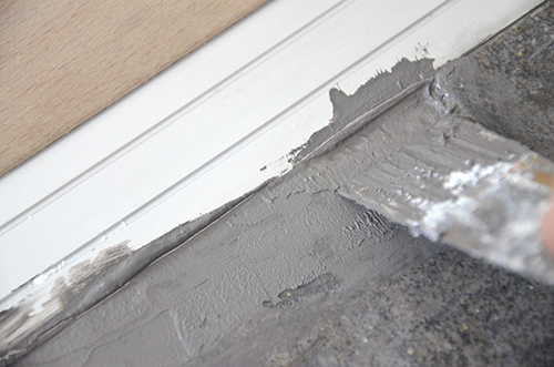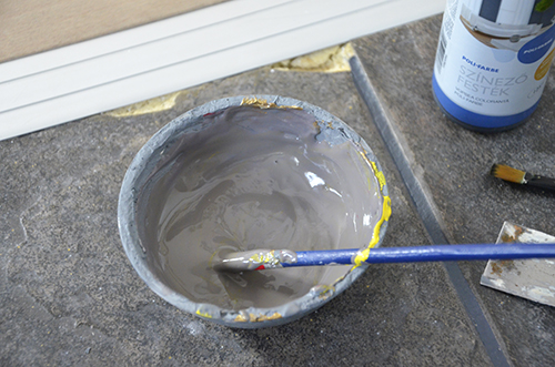 Amikor már nagyjából jónak ítéltem a színt elkezdtem hozzáadagolni glettgipszet (0-6 mm-es típust), szerencsére ez is volt itthon, hisz a falbontás utáni gletteléshez kellett (ITT). A masszát homogén, sűrű, tejfölhöz hasonló állagúra kevertem (a gipsz hozzáadása nem világosít egyébként a színen) és spaklival a lyukakba kentem. A spaklival nem húzkodtam teljesen simára, és ecsettel is picit igazgattam rajta, hogy a járólap enyhén egyenetlen felületét az álatalam kialakított pótlás is kövesse.