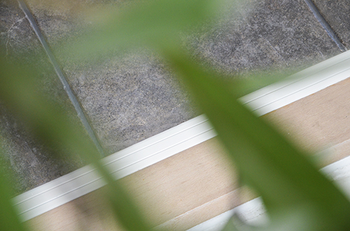 Fontos, hogy a száradást nem szabad hajszárítóval gyorsítani (sem hideg, sem meleg levegővel), mert az anyag a gyors nedvességelpárolgástól simán megrepedhet. A feleslegek letörlésével érdemes várni addig, amíg a felszín jól meghúz és akkor is csak óvatosan, egy nedves törlő segítségével tisztogassuk a környező részeket, nehogy a friss alkotásunkba belerondítsunk. Persze, simán le is lehet ragasztani pl. a küszöböt, de annyira lelkes és kíváncsi voltam, hogy ezt jól el is felejtettem, haha. Ez az első kör utáni száradás, itt még látszik, hogy a nagyobb, mélyebb sérülés helye picit sötétebb, itt a belekent anyag „belesüllyedt” a lyukba:
