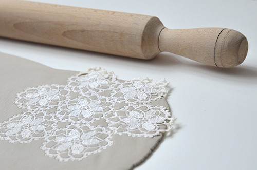 Fogtam egy nagy bútorlapot és azon kezdtem el a munkát. Kisebb adagokkal dolgoztam, mert így sokkal jobban lehet látni, érezni, hogy mennyire lesz vékony a kinyújtott gyurma. Én 3-4 mm vastagságot céloztam be, aztán jöhetett a csipke, amit szintén sodrófával nyomtam a puha felületbe.