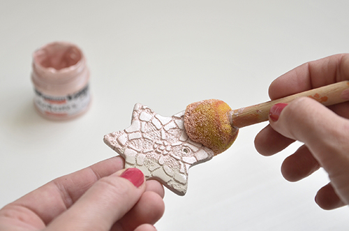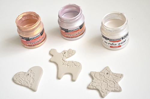 A festéshez Pentart gyöngyház festéket használtam simát és kaméleont is! Ehhez előtte le is lehet alapozni a formákat fehér színűre, de mivel elég világosra száradt a gyurma, így ezt a lépést én kihagytam, és egyből a gönygházzal mentem rá. Szivacsecsettel dolgoztam, de nem pamacsoltam, hanem húzkodtam, simítottam a felületen a szivacsot.