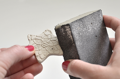 A széleket picit megcsiszoltam, amihez elég egy nagyon finom szemcsés csiszolópapír (vagy körömreszelő), mert a száraz gyurma szuperjól csiszolható, pár mozdulattal tökéletesek lesznek a szélek.