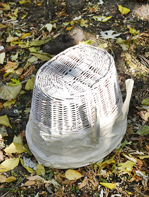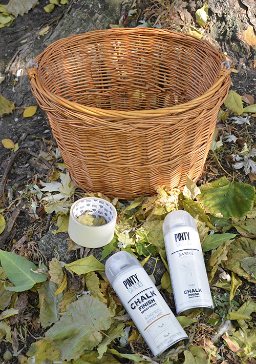 Így összepakoltam a sprayfestékeimet (egy krétafestéket és egy lakkot, ezúttal alapozót nem használtam), egy vastag maszkolószalagot és lesétáltam a házunk mögötti fákkal teli parkba. Első lépésként a kosár felső részét, és a rögzítő kampókat körbetekertem maszkolószalaggal.