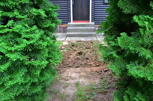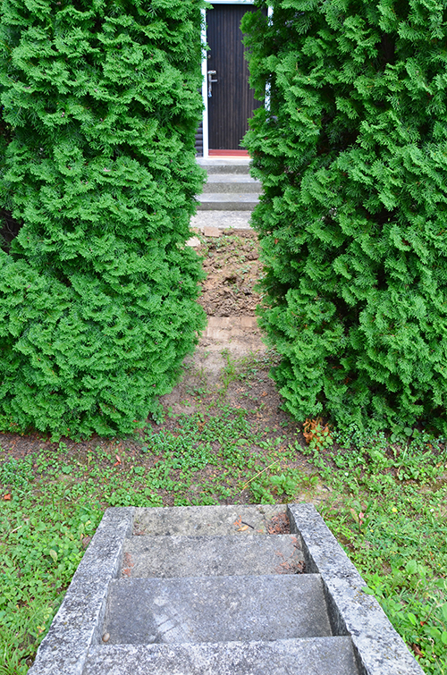 Itt már tudtam, hogy a bejárati ajtó és a hátsó lépcső között tuti végig van (volt) rakva ezzel a sárga kővel. A keramit egyébként egy tömörré égetett, mésztartalmú agyagból sajtolt nagyon tartós időjárásálló útburkoló anyag, egyetlen hátránya, hogy esős időben csúszóssá válik. Régen nagyon népszerű volt járdák, kapubeállók, mellékutcák burkolásánál, de később, a korszerű útburkoló anyagok megjelenésével fokozatosan lecserélték. Azért itt-ott még felfedezhető, pl. bérházak udvarain is. A korábbi fotókat megvizsgálva (ITT) is látszik, hogy a kertben több helyen valóban kis utak voltak kirakva.