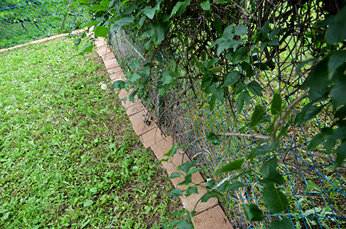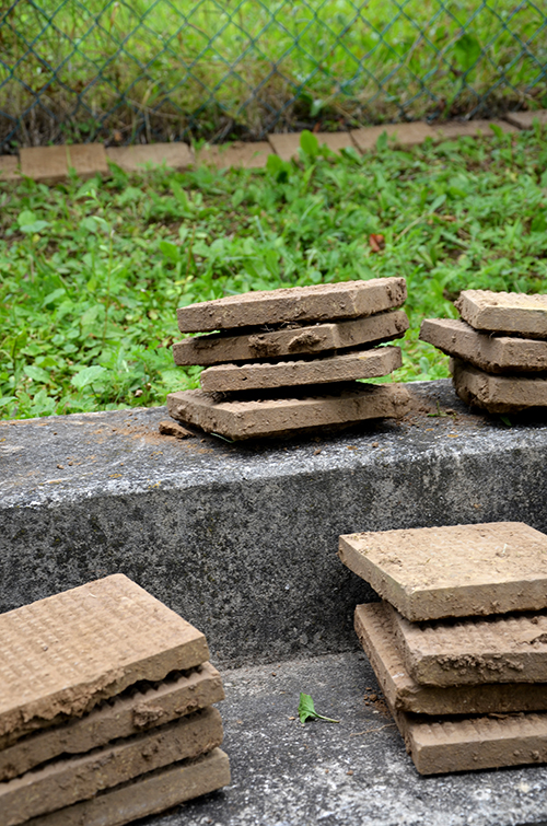 A kiszedett elemeket az előzőleg kigyomlált kerítés tövébe sorakoztattuk két okból: így ezzel darabig visszaszorítjuk a gazok gyors növekedését, másrészről a tisztítás első fázisát így majd a csapadék elvégzi. Annyira elfáradtam ugyanis a nap végére (nem ebben a munkában, hanem mindabban, amit előtte csináltam), hogy nem volt erőm még nekiállni sikálgatni a köveket. Különben is, egyelőre pihenőpályára rakom őket, nem létkérdés, hogy ezek most azonnal újra legyenek építve.