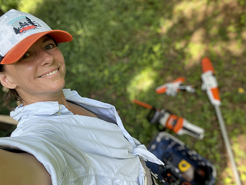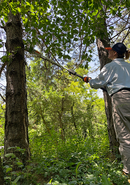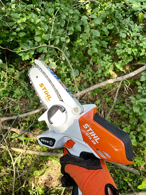 A napokban az erdei fenyők elszáradt részeit távolítottam el magassági ágnyeső (HTA 50) segítségével, a darabolást pedig a rovarhotelnél is használt kézi ágvágóval (GTA 26) végeztem. A rovalhotelről ITT írtam egy korábbi bejegyzésben.