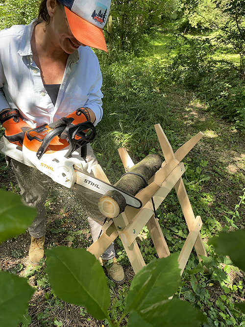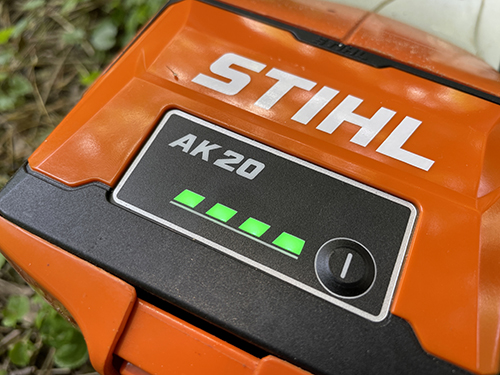 Elsőként az akkumulátort töltöttem fel, és előkészültem a munkához fűrészbakkal és védőfelszereléssel (kesztyű, szemüveg, hosszú nadrág, bakancs, stb.). Ez az akkumulátor egyébként kompatibilis a magassági ágnyesővel.