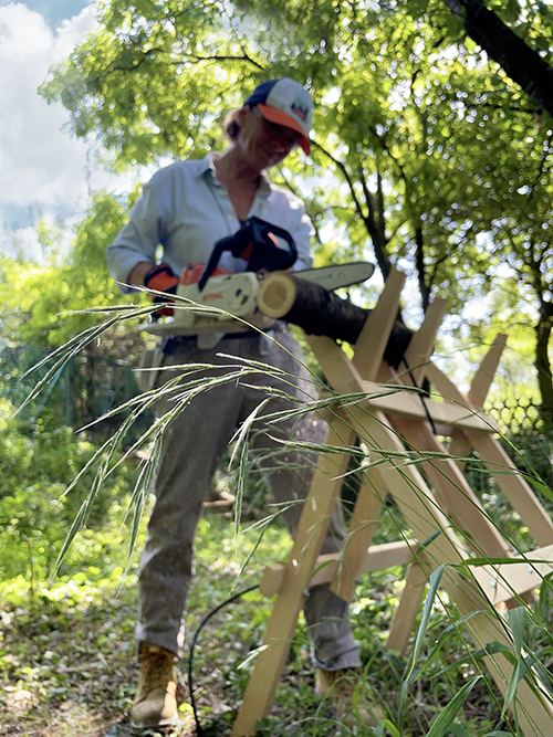 Viszont ennek a bejegyzésnek a főszereplőjét, a meggyfámat már március elején kivágtuk, ugyanis a fény hiánya miatt az utóbbi években nem igazán hozott termést. Azóta másfél méteres rönkdarabok formájában várta, hogy új élete legyen a kertben…