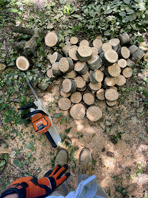 Az első nap odáig jutottam, hogy favágás után az összes szeletet portalanítottam, majd felpakoltam a műanyag kerti talicskámra, és felvittem a tett helyszínére.