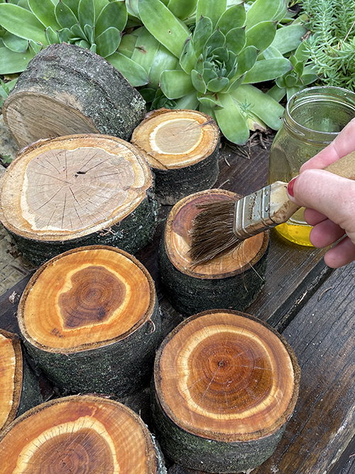 Miután az összes szelet a helyére került, elkezdtem őket szép sorban lekezelni lenolajjal. Ez mélyen beszívódik a fa pórusaiba, ezzel meghosszabbítva az élettartamát és szépen kiemeli annak erezetét.
