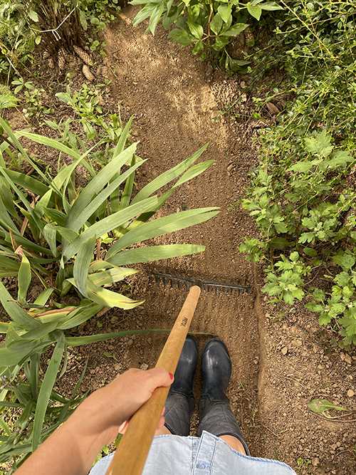 Az elképzelésem az volt, hogy a korábbi egysoros keramit tipegők helyett egy valamivel szélesebb ösvényt készítek, ennek mértéke a gereblyém szélessége lett. A felszedett keramitok mellett kigyomláltam, és ásóval alakítottam ki a széleket.
