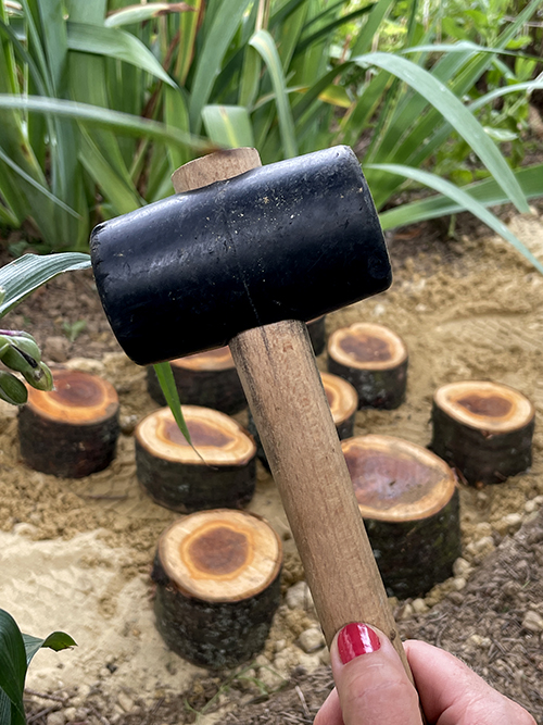 A lerakás során használtam gumikalpácsot is, főleg a díszkert külső, lejtősebb részén.