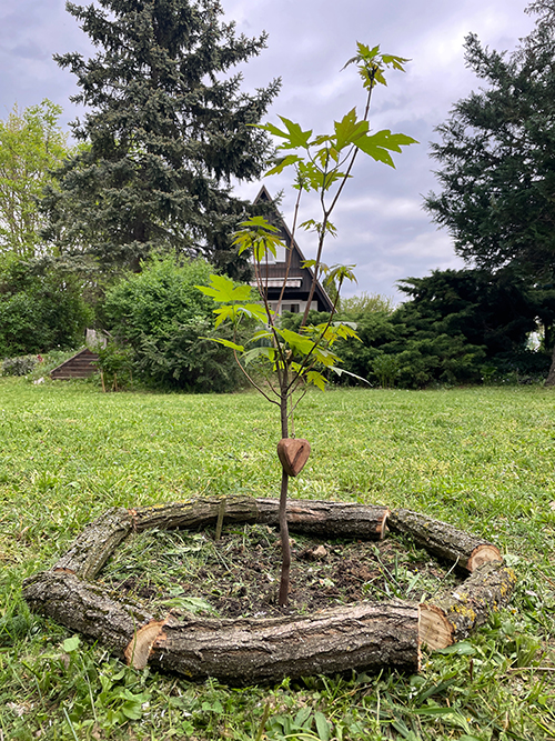 Így én március óta csak a száraz ágakat vagdosom, akad belőle bőven. Ezekből a tűzrakáshoz szoktam félrerakni, vagy mennek a komposztálóra, illetve a fák köré dísznek, jelölésnek, ahogyan ezek az akác ágak az ezüst juhar köré az áprilisi ültetést követően.