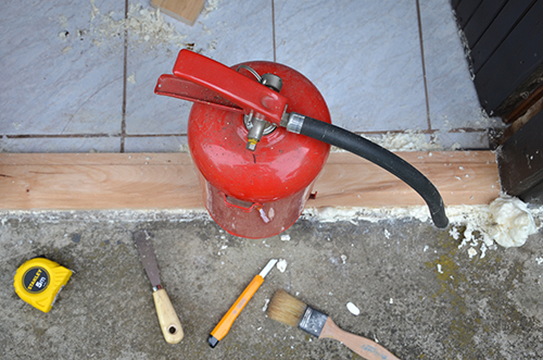 A rögzítéshez szintén a ragasztós purhabot használtam nehezéknek pedig egy tűzoltókészüléket tettem rá (ebből több is van a faházban). Pár óra múlva elkezdtem a kinyomódott felesleget levágni sniccerrel.
