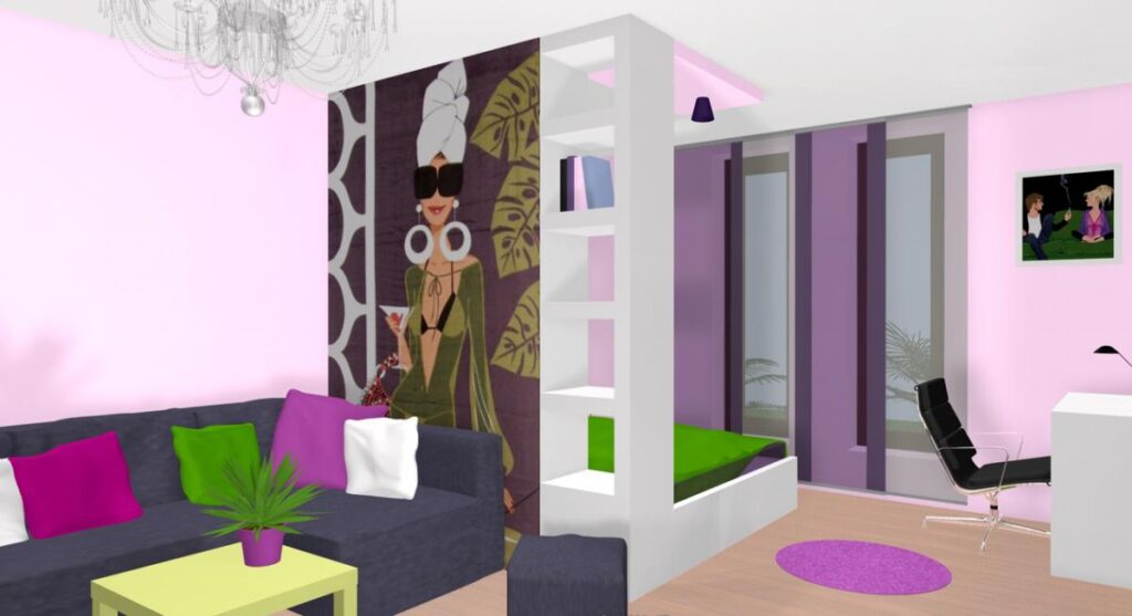 Az első dolog – mielőtt elvesznénk a tervezés részleteiben (mint bútorok, színek, anyagok stb.) -, hogy a funkcionális tereket meghatározzuk és elkülönítsük. Mivel Kinga lakása kis méretű, ezért a fizikai elválasztás nem célszerű. Így egy térben kell gondolkodni: tehát a konyha, nappali, étkező, sőt a hálószoba is egy légtérben lesz.