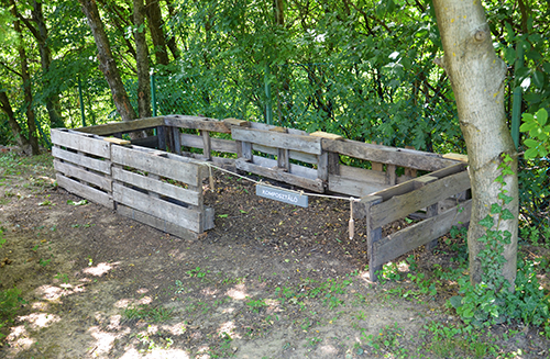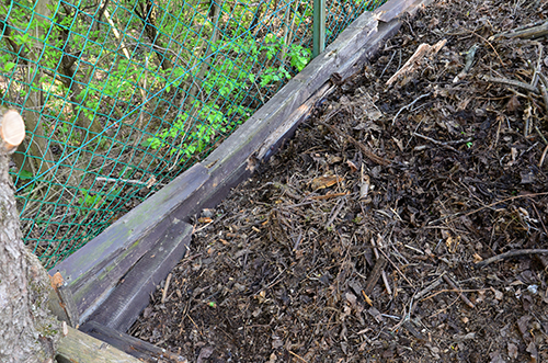A komposztáló egyik felét nyitva hagytam, ugyanis a 3 oldalról erdővel körbevett telkemben meglehetősen sok zöldhulladék keletkezik, aminek egy részét sokkal könnyebb itt behúzkodni gereblyével, mintha kézzel kellene bepakolgatni. És nagyjából ugyanez a magarázat a nagy méretre is (kb. 360×120 cm), bőven legyen hely a száraz ágdaraboknak, leveleknek, fűnyesedéknek, konyhai szerves hulladéknak, stb…