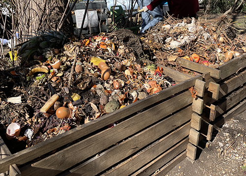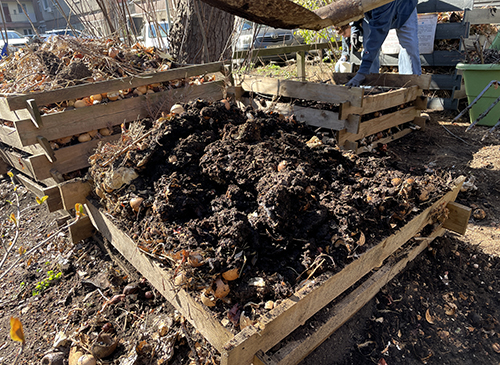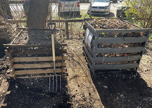 A közeli közösségi kertből egy másik házban lakó szomszédnak köszönhetően még kaptunk plusz egy ásót és egy vasvillát, így még gyorsabban lehetett a komposztkeretek tartalmát kilapátolni. A módszer egyébként az volt, hogy a kilapátolással együtt a kereteket lebontottuk, és újraépítettük (az egyik komposztálót át is helyeztük), és új rétegrendet alakítottunk ki.