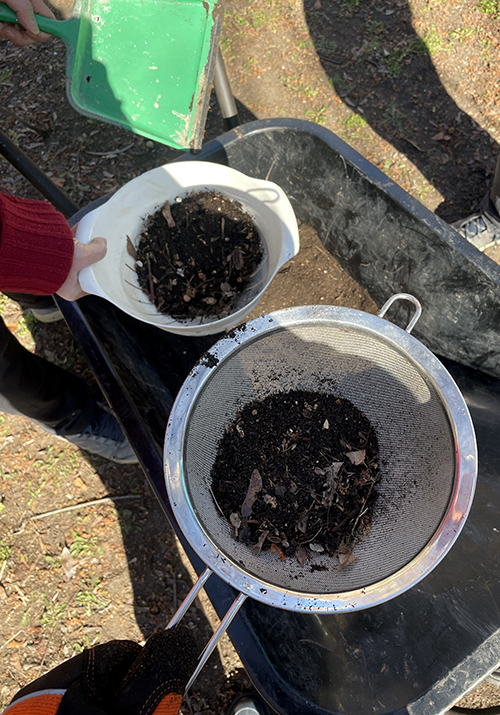 A kinyert komposztált föld egy részét a parkban lévő növények körül terítettük szét, másik felét finomra szitáltuk, hogy mindenki kedvére vihessen belőle a szobanövényei számára. Én általában 1 rész szitált komposzthoz, 2 de inkább 3 rész virágföldet keverek. Ha a kertben használom fel, akkor szétoszlatom pár cm vastagságban, és gereblyével óvatosan összehúzom/összekeverem a növények alatti földdel.