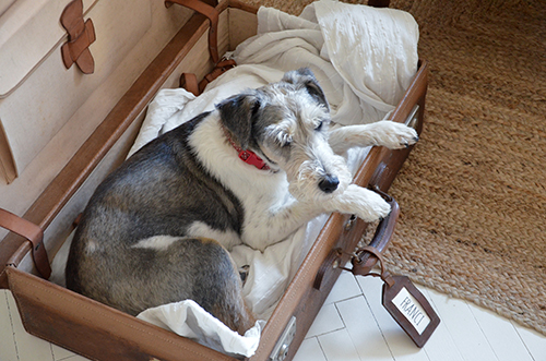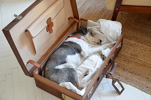 Franci bárhol, bármikor, bármilyen pózban el tud aludni, legyen az a kanapé legkényelmesebb pontja, a padló, vagy éppen a bevásárlókosaram. Igazából néha olyan, mint egy cica. Ezért is gondoltam, hogy egy bőröndből kialakított fekhely biztosan elnyeri a tetszését.