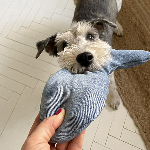 Mondjuk, amikor felkelt, rögtön rá is harapott az új játékára. Egyébként ezt a játékot nyugodtan lehet mosógépben is mosni, és amikor tönkremegy (mert idővel minden kutyajátéknak ez lesz a sorsa), akkor maradék anyagból bármikor lehet újat készíteni. Ez is egy módja annak, hogy ami már hordhatatlan, az ne végezze rögtön hulladékként.