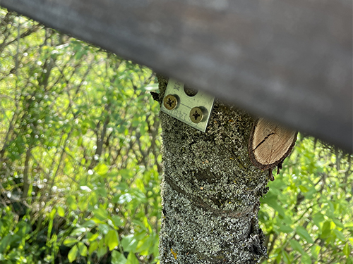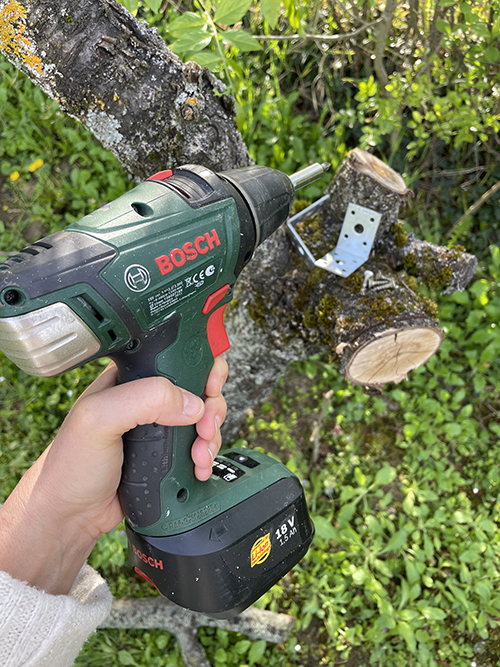 Mindössze 20-30 cm-rel kellett volna odébb lennie, de ezt lógatva már nem tudtam megoldani. Így jött az ötlet, hogy a meggyfa ágát vízszintesre vágva inkább arra rakom rá, alul sarokvasakkal és csavarokkal rögzítve.
