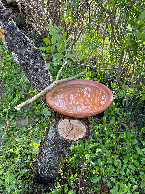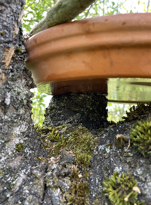Az itatót sem bonyolítottam túl, fogtam egy agyagcserép alátétet, és ezt helyeztem el úgy, hogy biztonsággal álljon a fa korábban elágazó törzsén. Egy ágat azért odacsavaroztam a pereméhez, hogy lebillenni se tudjon.