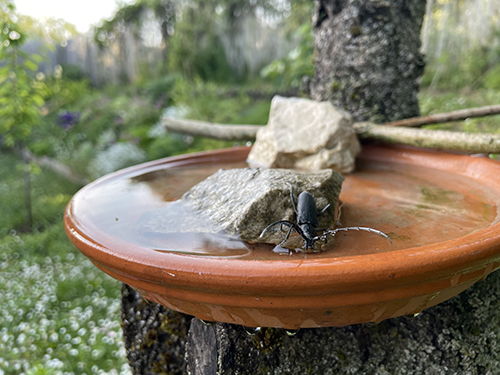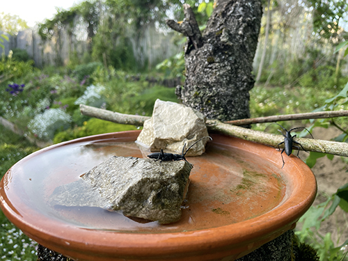 Utolsó lépésként a vízzel teli tálba raktam két követ is, így rovarok, bogarak is meg tudnak itt pihenni, illetve ha netán véletlen pottyantak a vízbe, ki tudnak mászni.