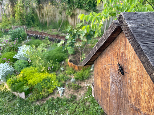 Erről a meggyfáról egyébként korábban írtam már (ITT), sőt a madáretetőről is, ami akkoriban a meggyfa egyik ágán lógott felakasztva. Csakhogy időközben ezen a részen is felvirágzott a kert, és egyre többet közlekedtem erre, lett egy új ösvény a hátsó kerítés mentén és kialakulóban van egy lépcső is. A madáretető pedig éppen közlekedési útvonalba lógott…