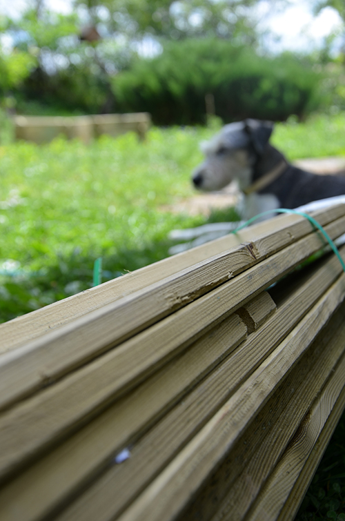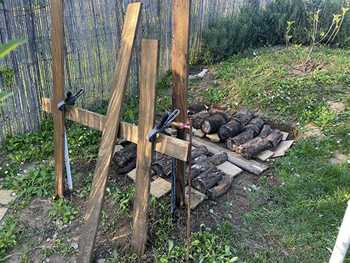 A veteményes helyét 3 hónapig kartonnal takartam, amiket farönkökkel súlyoztam le. A szétszedett fenyődeszkákat pedig újra felhasználtam, méghozzá a földből kiálló vízcsövem takarására.