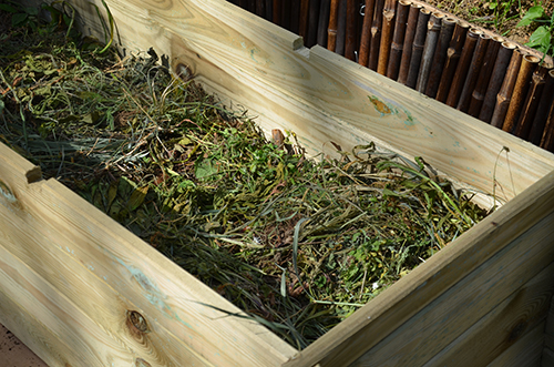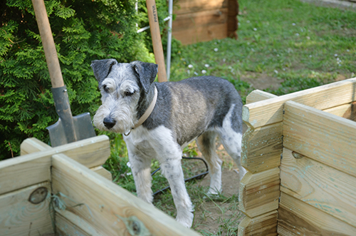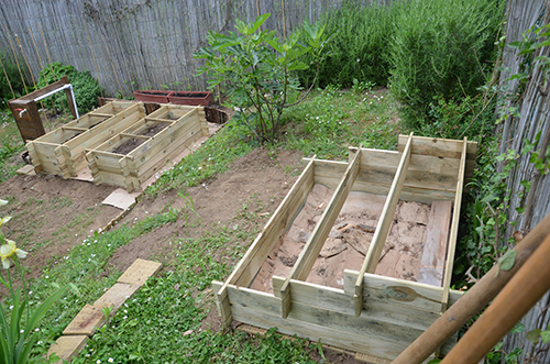 Az összes magaságyás aljára kartonokat fektettem le, erre jöttek a kisebb tuskók, faágak, majd gallyak, fűnyesedék, elszáradt levelek, komposztos föld és végül a termőföld.