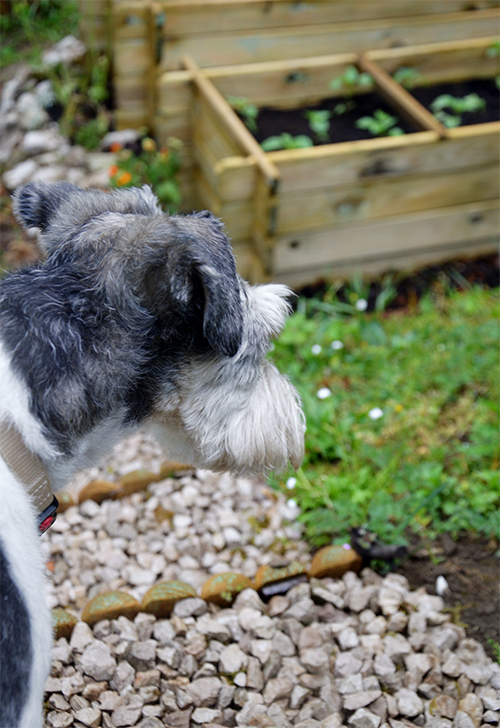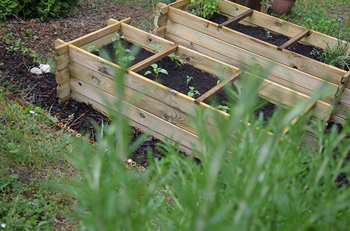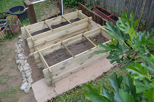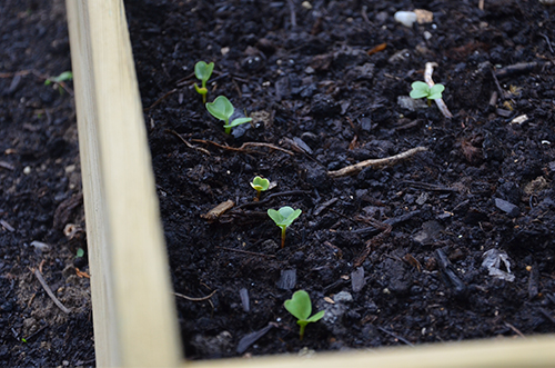 A lépcsőzetes magaságyásba bab, retek és tépősaláta került, már elkezdtek kibújni…