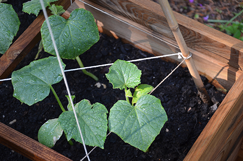 Ide kerülnek még a saját termésről fogott magokból kinőtt padlizsán palánták, a már elültetett tárkony és a kakukkfű mellé. Az uborkák viszont már növekednek, az egyszerű támasztékot bambuszkarókból és madzagból alakítottam ki.