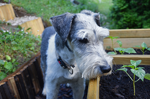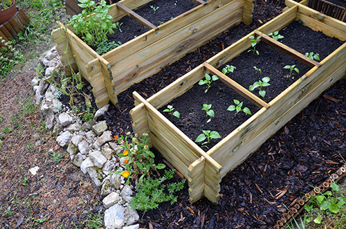 Az egyik magaságyásba bazsalikom, oregánó, snidling és paradicsom került, a másikba paprikák, de hagytam egy kis helyet itt is a padlizsánoknak.