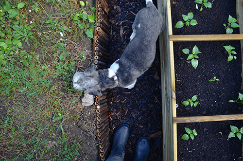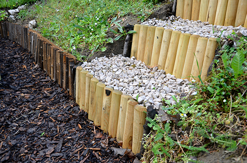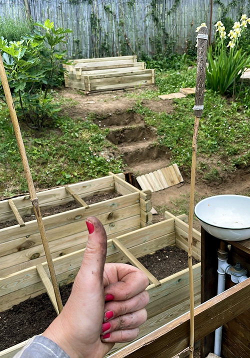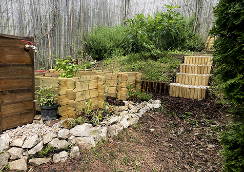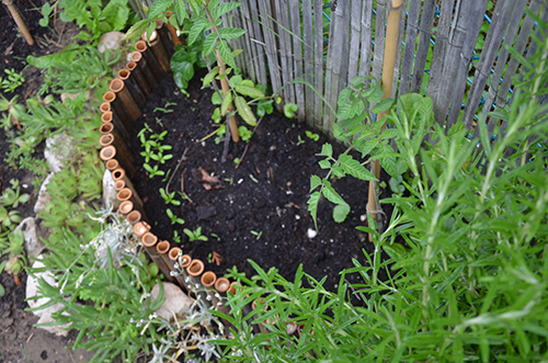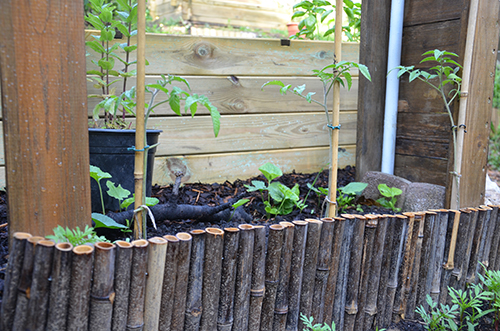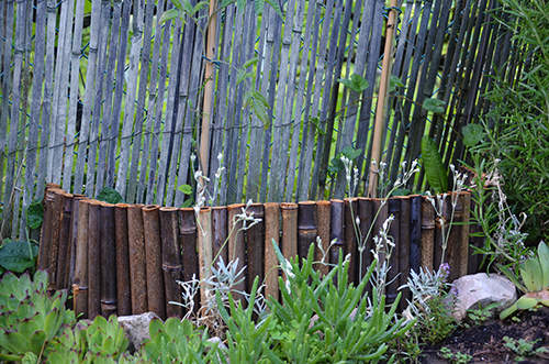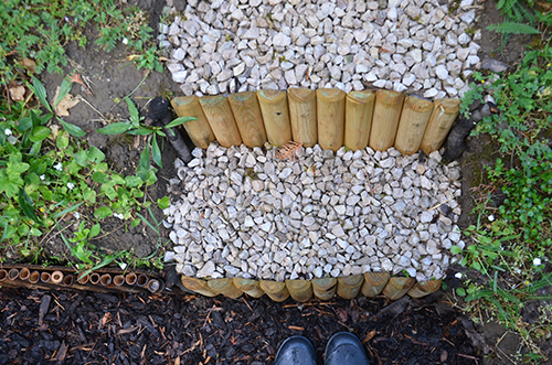 Bambusz ágyásszegélyt ütögettem le gumikalapáccsal, mögé ugyanúgy az újrahasznosított gumiszegélyt raktam, hogy a föld ne szökjön a rések között. Ez a szegély hajlítható, így íves részeken is nagyon jól lehet használni. Ez gyakorlatilag két oldalt körbeölel az ágyások körül.