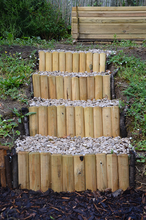A 20 cm magas fa ágyásszegélyt mélyen leütött vas pántok tartják hátulról, amit most nem fotóztam le, de erről a megoldásról egy szélesebb lépcsőtípus esetén lesz részletes leírás ugyancsak júniusban.
