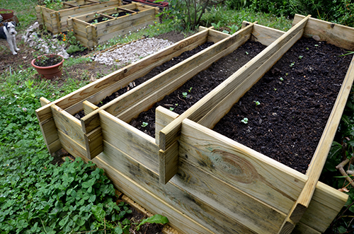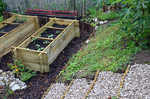 A magaságyások között kb. 40 cm széles hely van, nem mondom, hogy táncparkett, de használat szempontjából ez már éppen jó. Ha picit több helyem lett volna, akkor persze 50 cm széles sávokat alakítottam volna ki, de hát nem volt.
