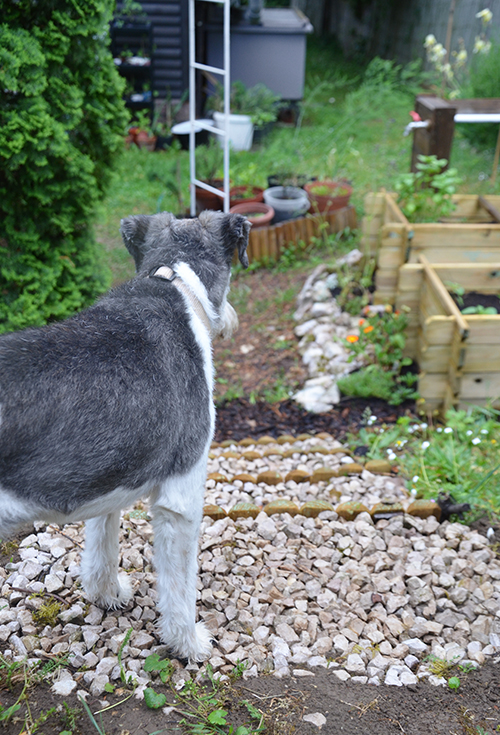 A futtató kapu jobb oldalára egyébként ültettünk egy lila akácot a kertész barátokkal, a másik oldalára (a vízakna tetejére) valami ládában nevelt futónövényt tennék, még az is lehet, hogy egyszerűen csak babot futtatok fel.