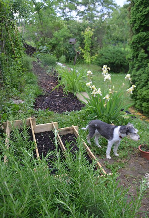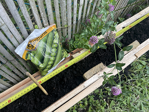 Így a bejegyzésem vége fele közeledve mutatok egy ráadás DIY emelt ágyást (ez csak 20 cm magas). Egy feldarabolt raklapból dobtam össze, de pár maradék lécet is felhasználtam hozzá. A kerítés mentén ez egy jó kis napos rész, szóval egy sor borsónak ideális hely 2,5 méter hosszan. Két hete vetettem el a borsót, lassan ezt is kötözni kell majd.
