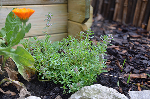 A magaságyások elé körömvirágot, zsályát és terülő kakukkfüvet ültettem, és elszórtam bársonyvirág magokat is.