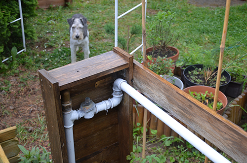 Takarás csak elöl van, hátul látszik a cső, de amúgy tényleg nem zavar. Nemsokára úgyis elrakarja a sok paradicsom, ha pedig szerelni kell, könnyen hozzáférünk.