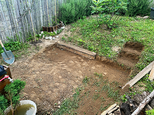Itt sokszor rohangáltam fel-le a rozmaring sövényemhez, mert az odébb meglévő kőlépcső kiesett a közlekedési útvonalból. Szóval a kitaposott részen ásóval lecsaptam függőlegesen és vízszintesen a földet, majd ide is ágyásszegély került, a fokokra pedig kartonlapra rétegezett murva. A kulisszák mögött pedig nagyjából ez zajlott: