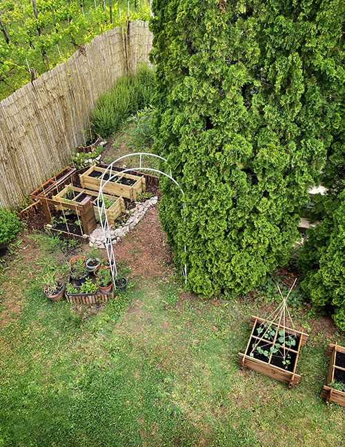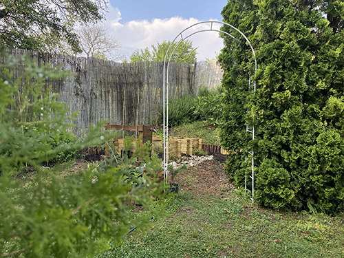 Ez tereprendezés után sem lett nagyobb (bár itt-ott tudtam 10-20 cm-es sávokat hozzácsapni a rézsűs részekből), de mivel itt optimális a konyhakert kialakítása, pl. vízvételi/öntözési szempontból, napos/árnyékos órákat tekintve, stb., ezért ebből igyekeztem kihozni a maximumot. A boltíves futtató a „bejárat”, ami eredetileg zöld színben kapható, de én átfestettem fehérre, ITT írtam róla. Mellette pedig egy vízakna van, amit mindenféle cserepekkel igyekszem álcázni, tulajdonképpen szaporító állomás is, haha. De ha télire elzárjuk a vizet, akkor ide hozzá kell férnünk, szóval csak mobil dolog pakolható rá.