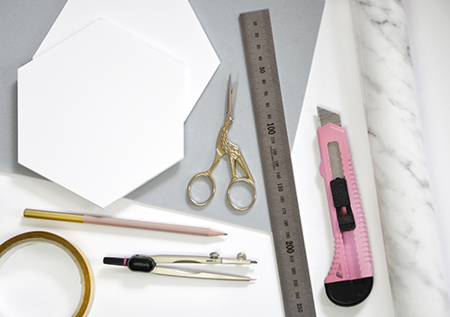 Ehhez pedig a következőkre van szükség: habkarton (5 mm vastag), ceruza, körző, fémvonalzó, sniccer, olló, kétoldalas ragasztószalag, öntapadós márványmintás fólia és dekorgumi. A habkartont a Pantonban szoktam beszerezni, de persze más alternatíva is létezik alapnak, pl. lehet simán vastag kartonra, vagy régi söralátét kartonra is ragasztani a fóliát. Sőt, megmaradt kisméretű csempére is, de abban az esetben az én ötletem nem megvalósítható, szóval maradnék a habkartonnál.