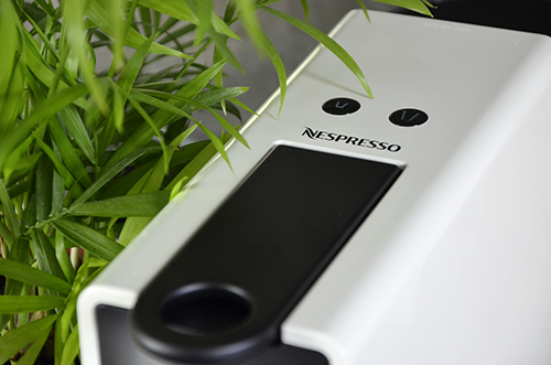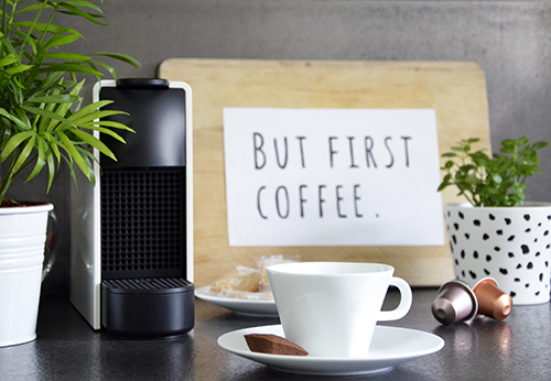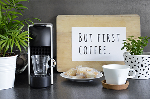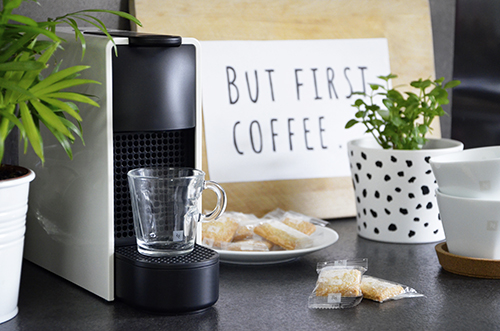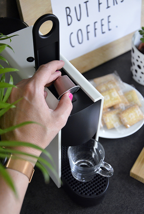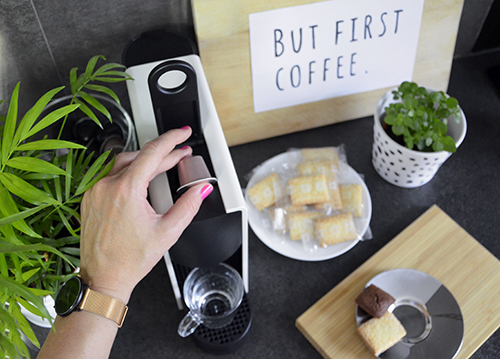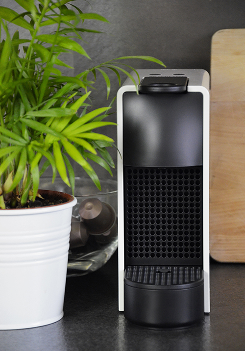 A fent említett korlátozott pakolófelület, valamint a fejemben lévő kevés, de mutatós dekorációs elemek miatt – amit egyszerűen igényelek! – ismét csak kis méretű gép jöhetett szóba. Ezért a választásom az Essenza Mini típusra esett, ami a Nespresso eddigi legkisebb kávégépe. Modern, letisztult, kompakt kis masina, ami önmagában is mutatós dizájn-elem. Kétféle formában kapható, az egyik A vonalú, háromszögre hasonlító (fehér, lime zöld és piros színben), a másik teljesen letisztult, határozott élekkel rendelkezik, ez fekete, szürke, és fehér kivitelben kapható. Én az utóbbit választottam fehér színben. Mostanában amúgy is bekúszott a púder mellé a fekete-fehér páros, szóval ez a gép ilyen tekintetben is telitalálat most nálam, jól passzol a diy dalmata mintás kaspómhoz is.